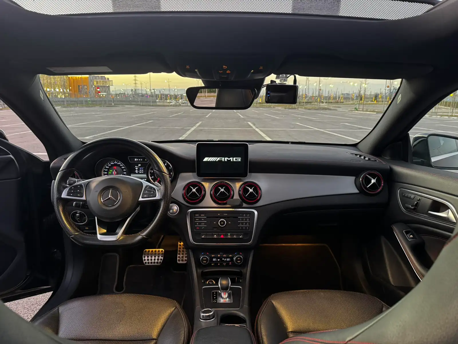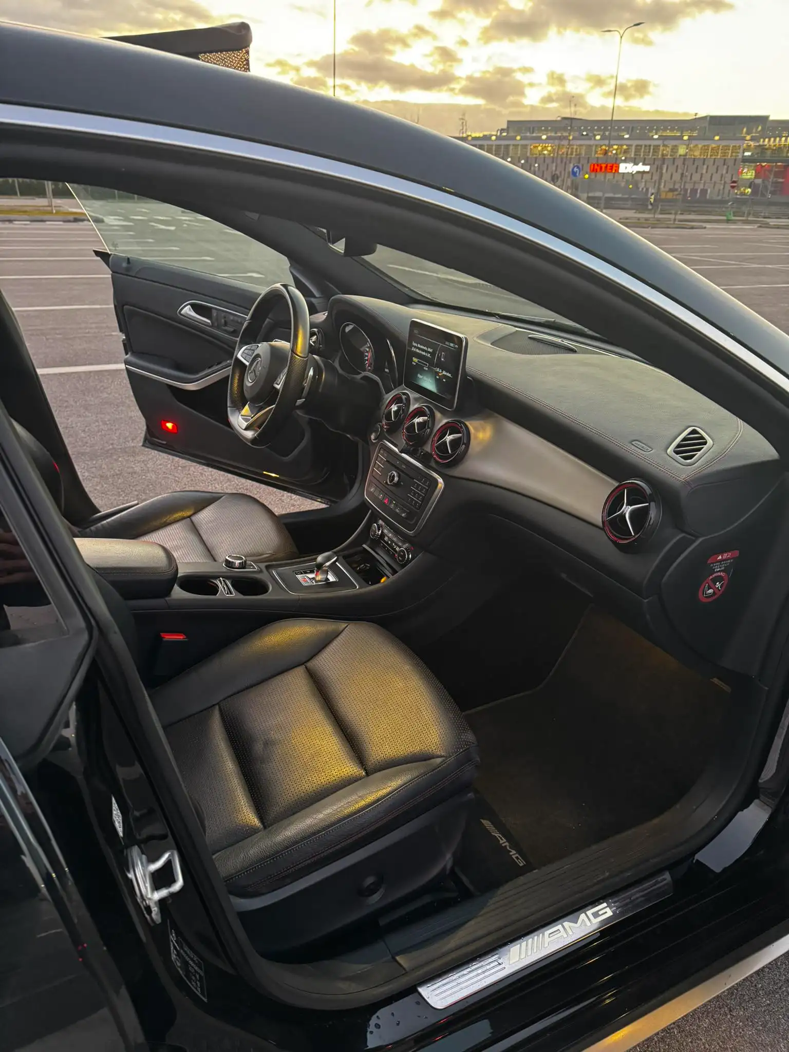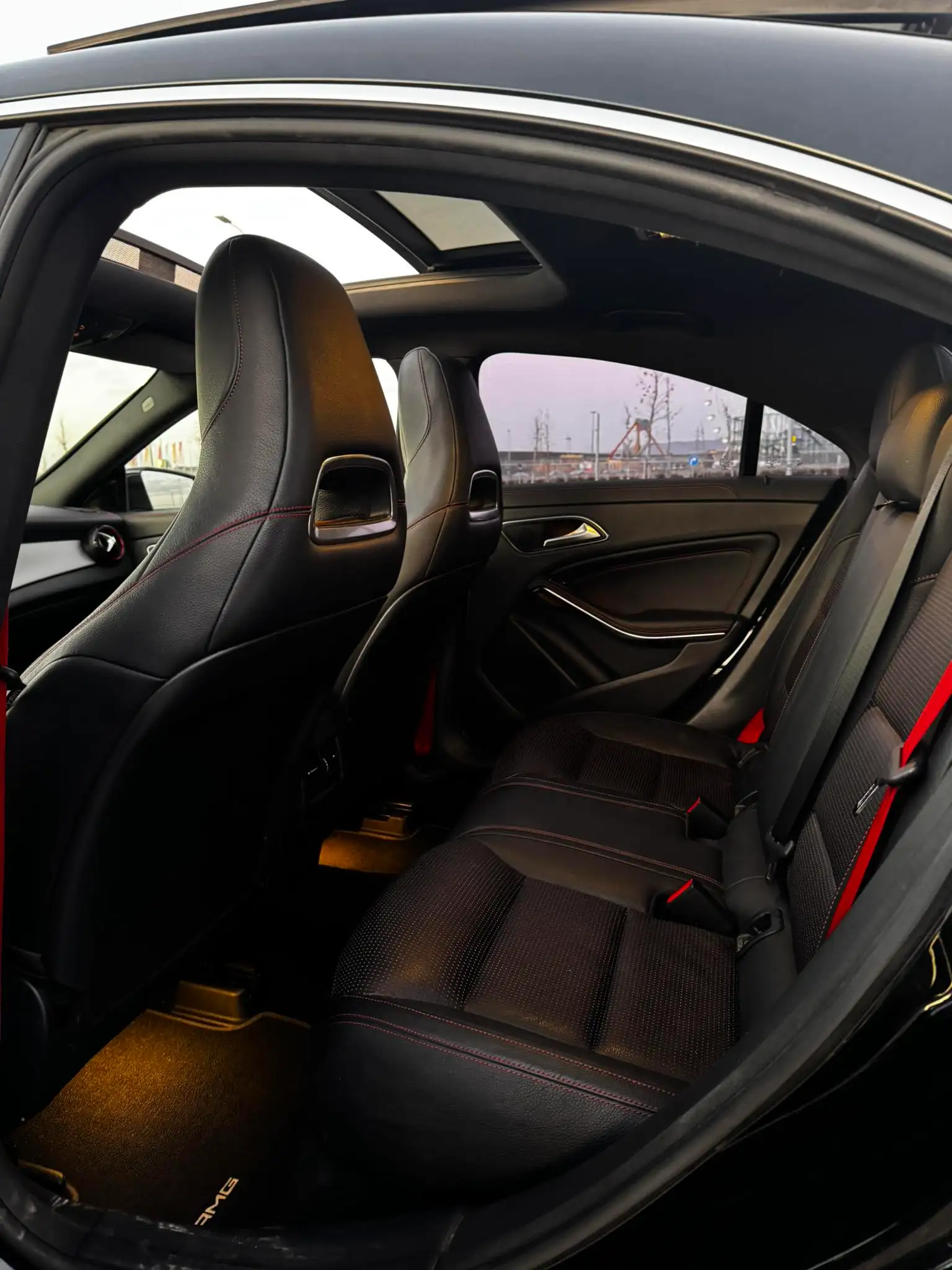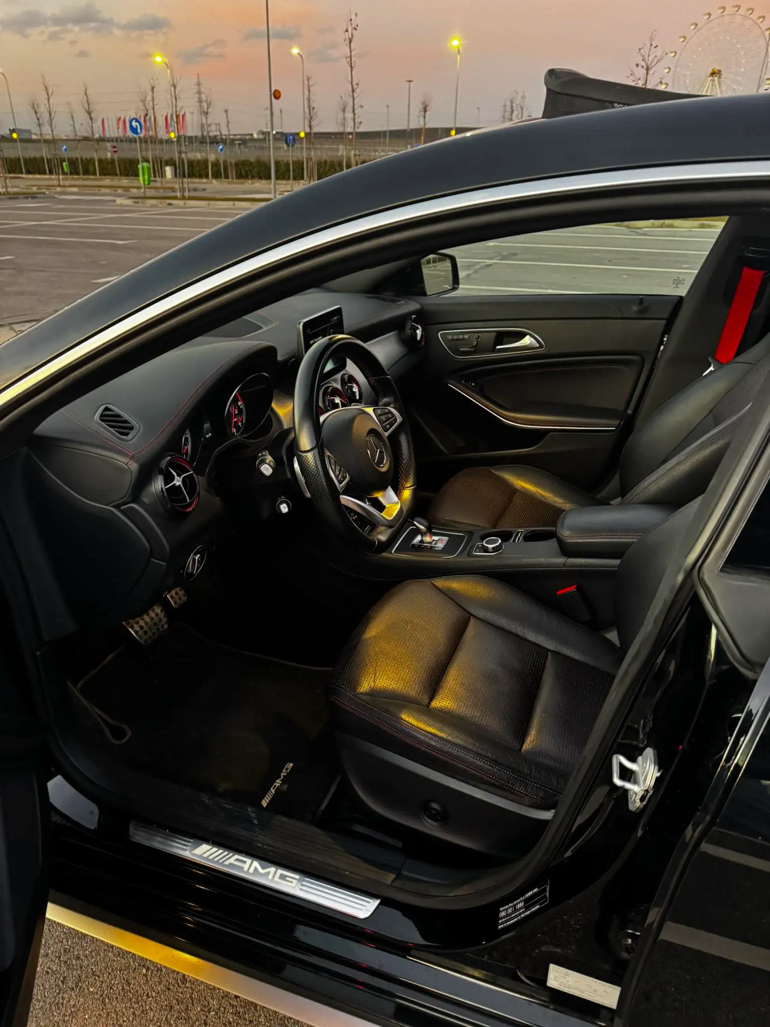 🔹 Brendësia: Lëkurë/Alcantara e zezë me qepje të kuqe sportive AMG